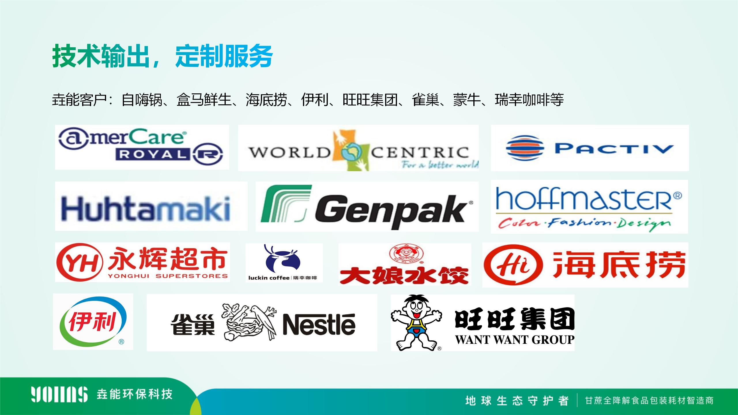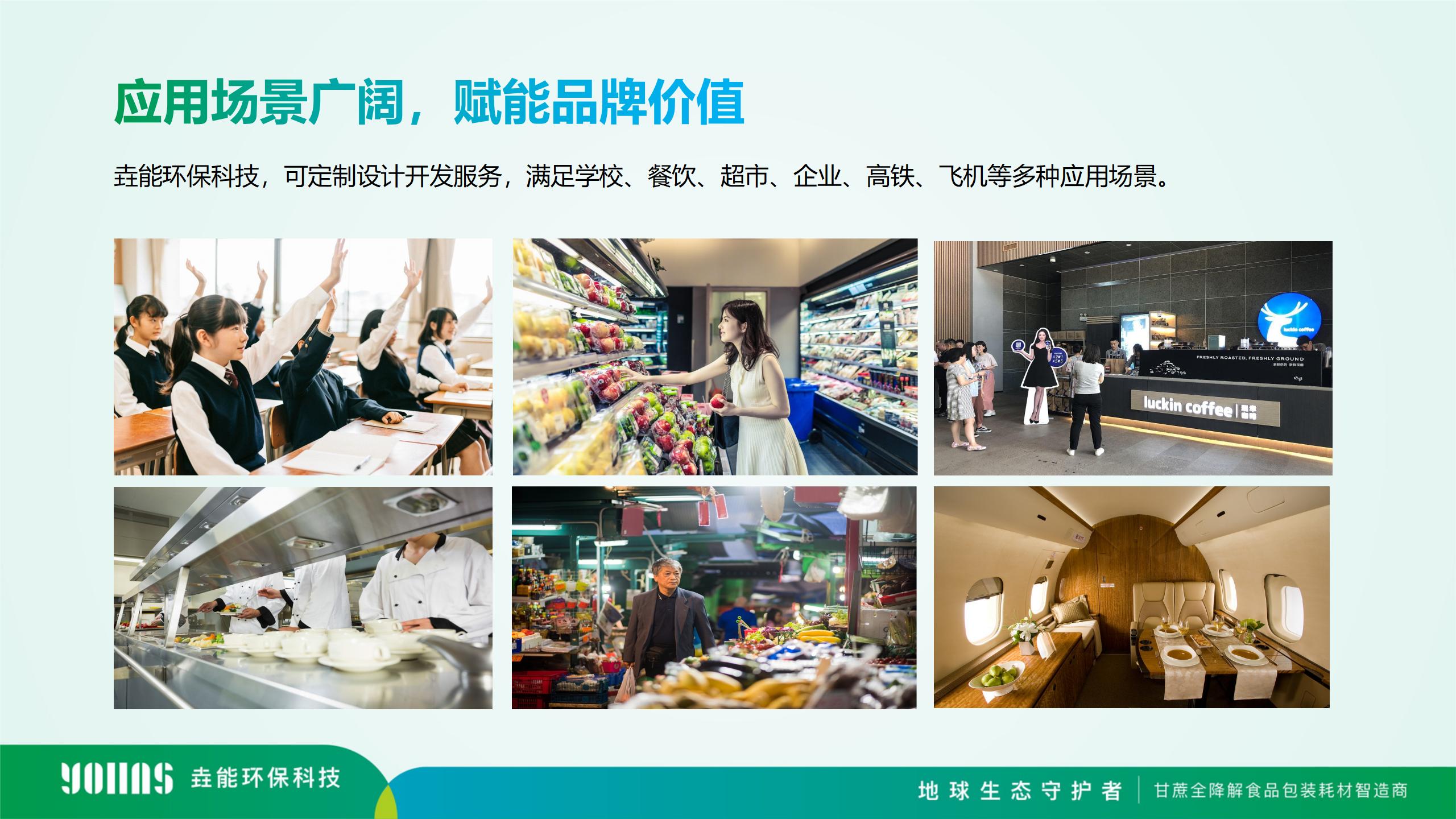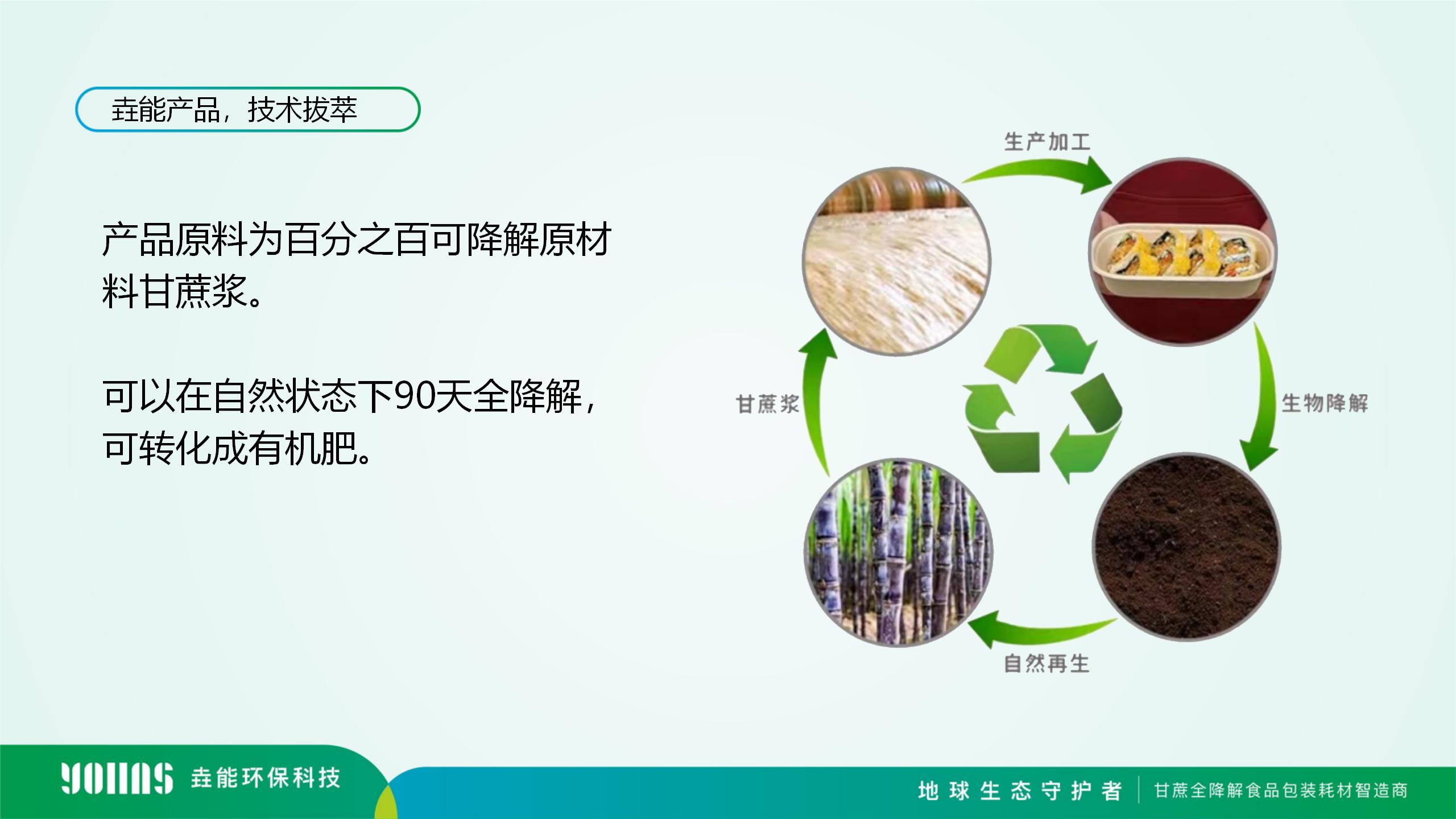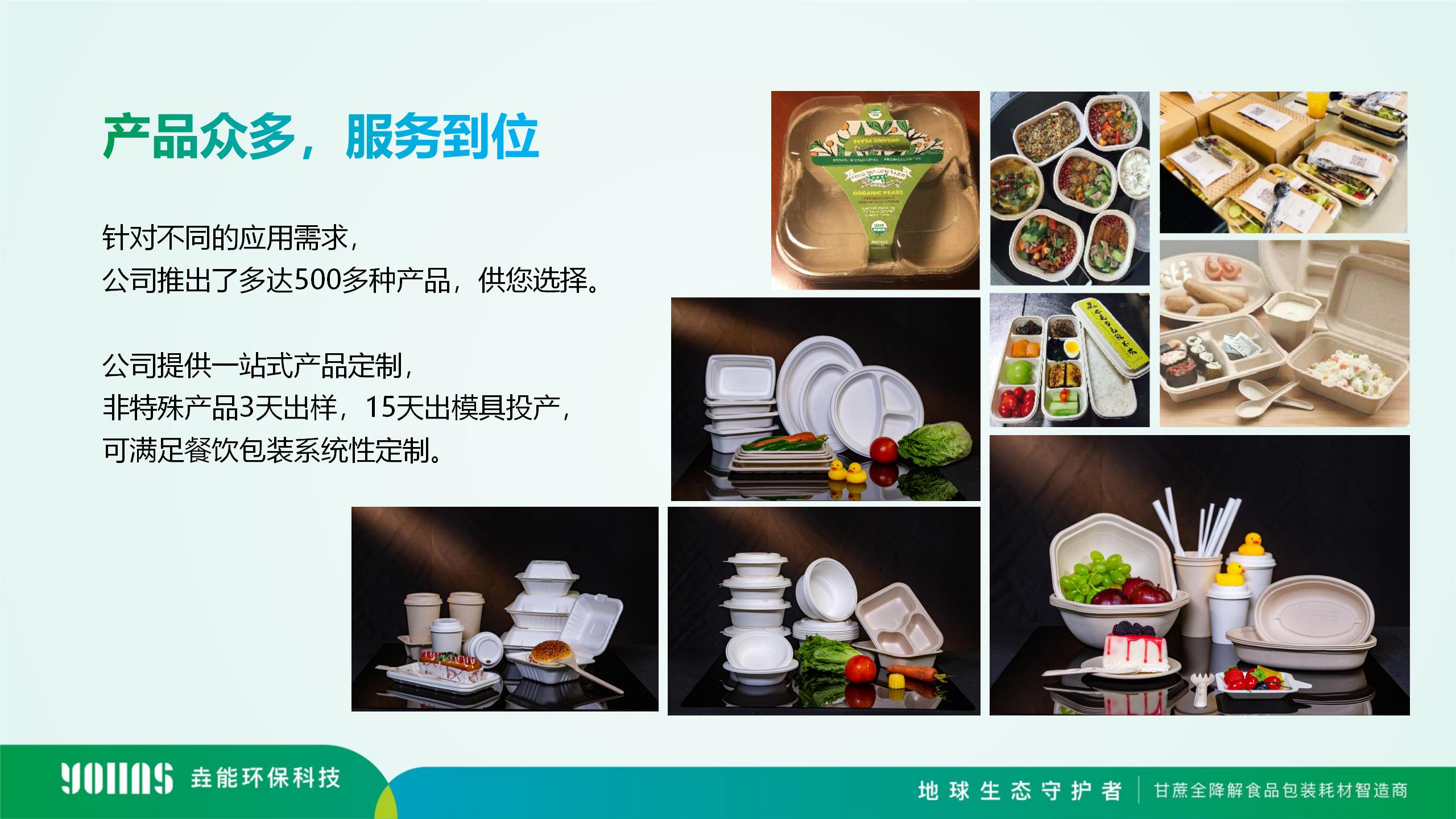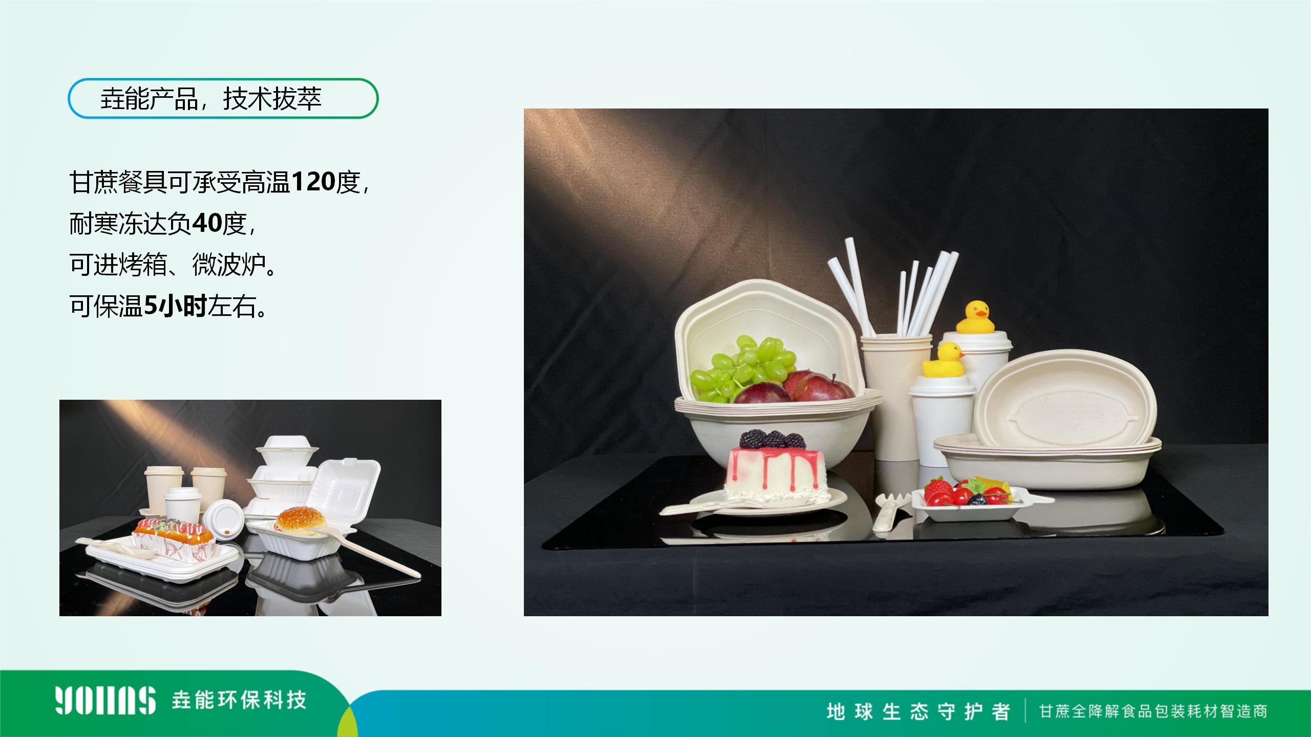 目前垚能環保的生物全降解餐飲具產品線推出以甘蔗漿、秸稈漿、PLA、PBAT等為原料,包括但不限于一次性全降解碗碟、杯具、托盤、打包盒、吸管、垃圾袋、快遞袋等,以及部分醫療耗才的包裝等產品,提供一站式產品定制,可滿足餐飲包裝系統性定制。